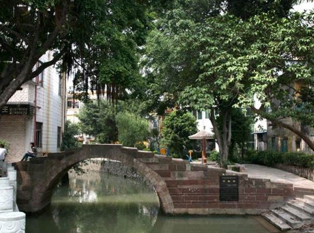 約15米長(zhǎng)的水色匝,彎彎曲曲地從西端不知名的角落流過(guò)雙美橋,站在雙美橋上,感慨它600多年的風(fēng)雨滄桑。雙美橋在1990年被公布為中山市文物保護(hù)單位,現(xiàn)該橋保存尚好。