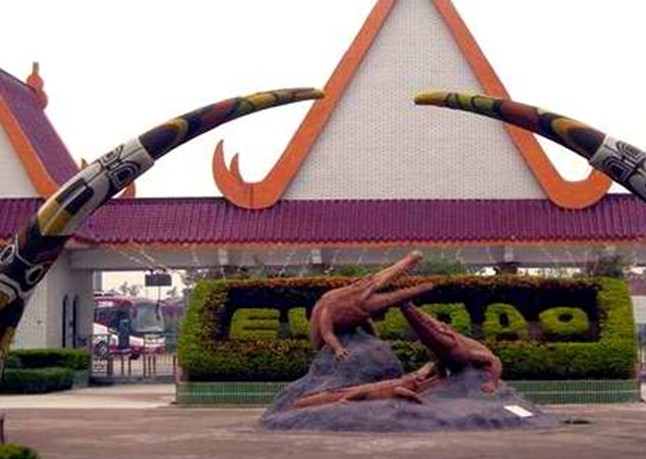 在白藤湖內(nèi)尖峰橋湖心路口即可望到鱷魚(yú)島那金碧輝煌,巍峨壯麗的泰式門樓,門前寬廣的停車場(chǎng)可一次性停放上百輛大巴,進(jìn)入大門后,有一個(gè)十分醒目、高達(dá)4米的大型鱷魚(yú)雕像——“鱷魚(yú)一家”吸收不少游客紛紛在此攝影留念,離雕像百米處,十多個(gè)鱷魚(yú)池座落在鮮花叢中、綠茵地上、池中養(yǎng)有我們祖先稱為“噴火龍”、“鮫龍”的楊子鱷、泰國(guó)灣鱷、馬來(lái)鱷、雜交鱷等四個(gè)品種,大小近千條,最小的有剛出殼的幼鱷,體型最大的有4米多長(zhǎng),重達(dá)千斤。