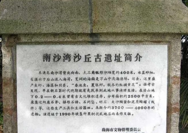 沙灣古遺址位于淇澳島東部高出海岸的沙丘上,1984年文物普查中在這里發(fā)現(xiàn)了新石器時代的彩陶文物,成為廣東省境內(nèi)屈指可數(shù)的歷史年代較早的古文化遺址之一。