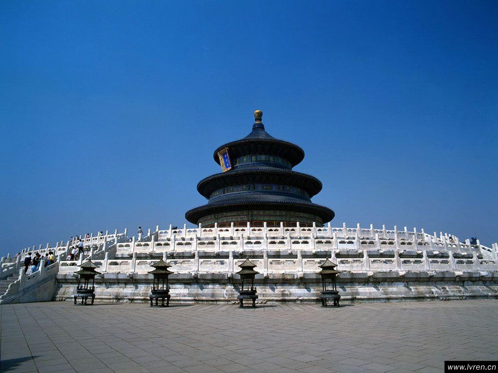 在整個北京城里,北有地壇祭地,南有天壇祭天,東有日壇祭太陽,西有月壇祭月亮,其中天壇最為光彩奪目、氣宇非凡。天壇始建于明永樂十八年(1420年),清乾隆、光緒時曾重修改建。為明、清兩代帝王祭祀皇天、祈五谷豐登之場所。天壇是圜丘、祈谷兩壇的總稱,有壇墻兩重,形成內(nèi)外壇,壇墻南方北圓,象征天圓地方。主要建筑在內(nèi)壇,圜丘壇在南、祈谷壇在北,二壇同在一條南北軸線上,中間有墻相隔。圜丘壇內(nèi)主要建筑有圜丘壇、皇穹宇等等,祈谷壇內(nèi)主要建筑有祈年殿、皇乾殿、祈年門等。著名的祈年殿在最北方,這是天壇內(nèi)最宏偉、最華麗的建筑,也是想象中離天最近的地方。祈年殿的上下三層屋頂,均用深蘭色琉璃瓦鋪蓋,象征天色。