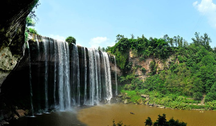 青龍瀑布(Qinglong waterfall)位于萬州區(qū)甘寧鄉(xiāng),距萬州城區(qū)30公里,景區(qū)面積60.13平方公里。這里是三國時期大將軍甘寧的故里。經(jīng)過專家測算,青龍 瀑布高 64.5 米,寬 115 米,比著名的黃果樹瀑布尚寬 19 米,是名副其實的亞洲之最。瀑布面積達7417.5平方米,是重慶市級風(fēng)景名勝區(qū)。該地區(qū)屬于典型的喀斯特地貌,山石陡峭,森林茂密。該瀑布的獨特之處不僅僅是因為它的雄偉壯闊,而是瀑布的走向是呈弓形,這使得瀑布成為名副其實的水簾洞。沿著瀑布內(nèi)部的小道前行,從瀑布里面眺望外面的景色,另有一番滋味。瀑布之下有一約 2000 平方米的石洞,造型奇特,令人神往,是游人坐洞觀瀑的絕佳去處;瀑布下游水草鮮美,落英繽紛,儼然陶翁之桃花源也。不遠處是甘寧將軍墓和甘寧雕像。青龍瀑布上游是甘寧水庫,是垂釣、蕩舟的好去處。對比中國其他地區(qū)的風(fēng)景名勝,青龍景區(qū)在自然景觀與人文景觀上都毫不遜色。
