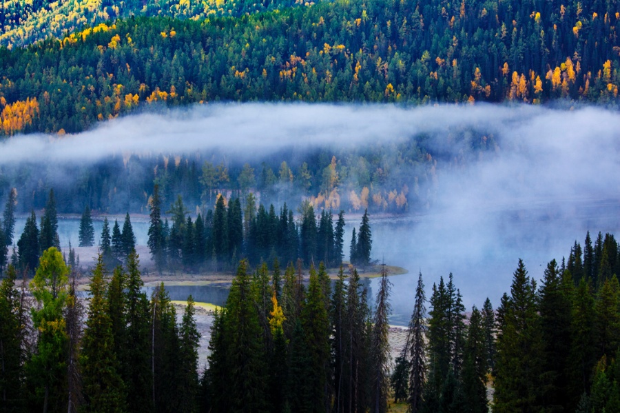 這里的河水將森林和草地分切成一塊塊似連非連的小島,人們稱之為“神仙灣”。它是喀納斯河在山澗低緩處形成的一片沼澤淺灘,從湖面背光處看去,在陽光照射下河水流光溢彩,連樹上的葉子都隨風(fēng)搖曳、閃閃發(fā)光,仿佛無數(shù)珍珠任情灑落,為此也被稱為“珍珠灘”。這里常有云霧繚繞,山景,湖水,樹葉相互映襯;綠色的白樺林,湛藍(lán)的喀納斯,紅色的小木屋,超凡脫俗,如夢如幻,如臨仙境,神仙灣由此名。