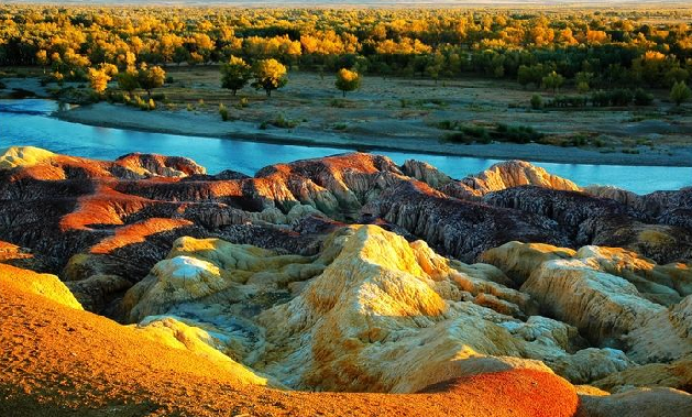 五彩灘的特別,還由于它色彩絢爛,形狀繽紛。因為這里有侏羅紀時代的煤層,經(jīng)過千萬年風(fēng)蝕雨剝以及河水的沖刷,在幾乎寸草不生的河灘上出現(xiàn)了紅、綠、紫、黃、棕等鮮艷的色彩。在河水的映襯和夕陽的照射下,當(dāng)你走進這高低起伏的“丘陵”地帶,就如同走進一個五彩斑斕夢幻般的世界,那些光怪陸離的色彩從四面八方撲面而來,都是那么明快、那么強烈、那么豐富多彩,真讓你感到目不暇接,眼花繚亂。除此之外,五彩灘又仿佛是一個造型奇特的天然泥塑館。這里既有形狀各異的山川高原,又有大小石峰、石墻、石柱、疏密相生,既有雄風(fēng)大氣,又有似水柔情。而形成這些不同造型并非堅硬的巖石,而是泥巖和砂巖,表面土質(zhì)都非常松,不小心踩一下碰一下就可能破碎。版權(quán)所有聊城聊之旅國際旅行社有限公司,轉(zhuǎn)載必究!但就是這些松弛的泥砂卻表現(xiàn)出了巨礫重疊,溝溝壑壑的景象。其中有的像神秘的古堡,使你疑問這里是否曾有誰居住?有的像凝固的瀑布,仿佛濃縮著當(dāng)年銀波翻騰的洶涌,有的形似怪獸、蜂叢……。