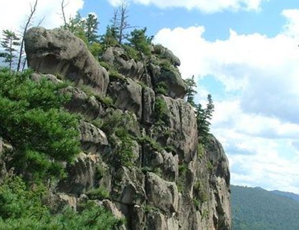 獅面山是一座面如獅頭的山,其鼻、嘴、眉清晰可辨,十分逼真,就好像獅子的面部一樣,它完全是大自然的神來(lái)之筆,未經(jīng)任何人的修磨,栩栩如生,別具風(fēng)姿。從景區(qū)入口踏上365個(gè)臺(tái)階的云梯階,一步步登向一棵松。365個(gè)臺(tái)階意味著天天向上,一天一個(gè)新臺(tái)階的意思。第一個(gè)景點(diǎn)為一棵松,登上一棵松頂端,向南可看到小興安嶺最高峰——平頂山俯瞰鄉(xiāng)村面貌和蜿蜒流淌的小河,北望懸羊峰,西觀桃山奇峰,腳下松枝上碩果累累,巖石正中生長(zhǎng)著的這棵百年紅松便是“一棵松”,在一棵松周圍還生長(zhǎng)著興安杜鵑,山蔥、石花等。清晨登上一棵松,可觀日出林海,雨后登上一棵松,仿佛置身云霧中,此刻,霧從谷底升,云從天邊來(lái),云霧就在您身邊,伸手可摸,這是思權(quán)亭。思松亭與一株百年紅松相偎依,微風(fēng)拂過(guò),松亭錚錚響,游客可坐在亭內(nèi)邊休息邊賞景。