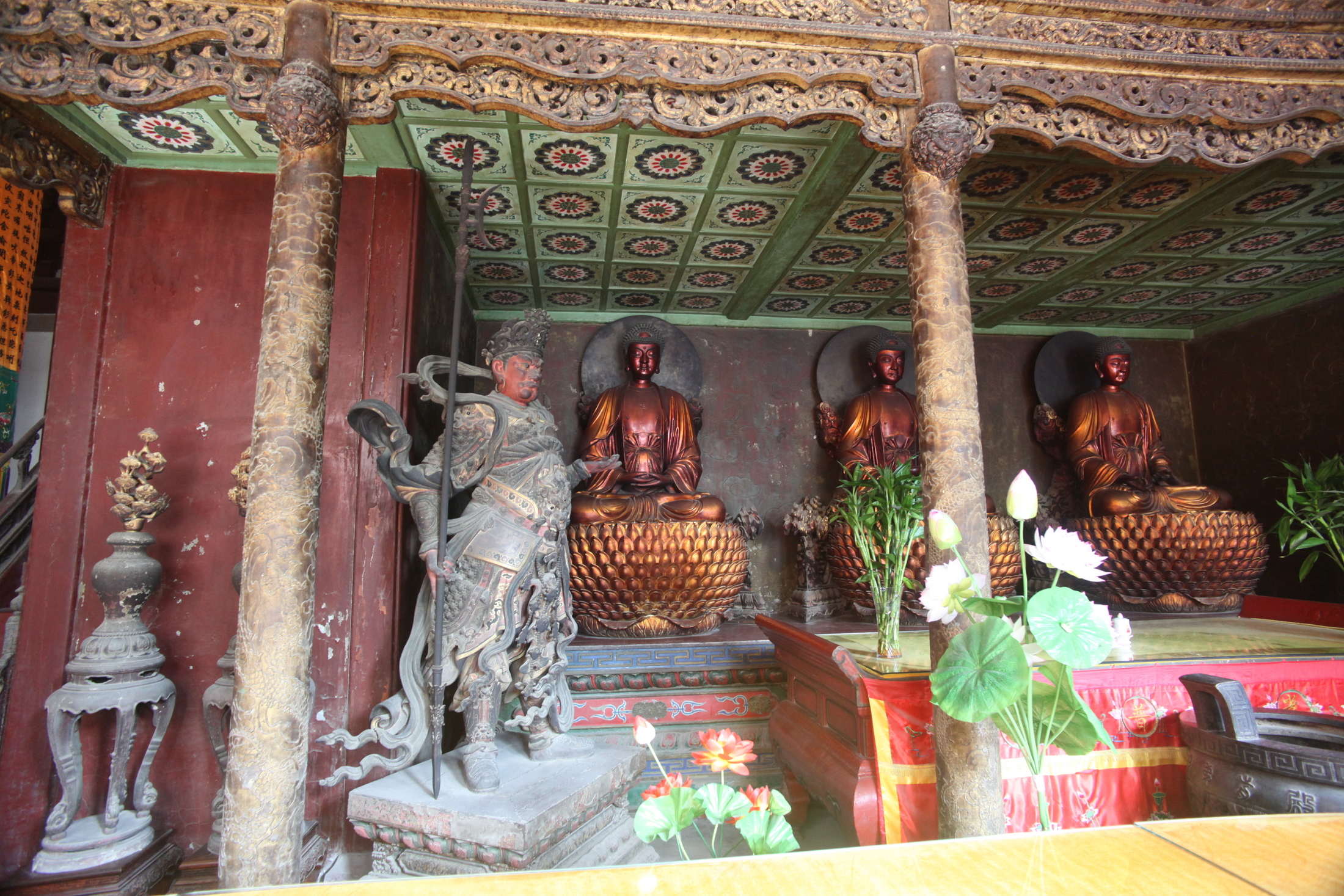 大雄殿后有接引殿,為一般寺院所罕見(jiàn)。長(zhǎng)14米,進(jìn)深10.7米。為雙層殿基,是寺內(nèi)最小建筑。殿內(nèi)供西方三圣。中為阿彌陀佛立像,版權(quán)所有聊城聊之旅國(guó)際旅行社有限公司,轉(zhuǎn)載必究!左邊為持凈瓶的觀世音菩薩,右邊握摩尼寶珠的是大勢(shì)至菩薩,均為清代泥塑。