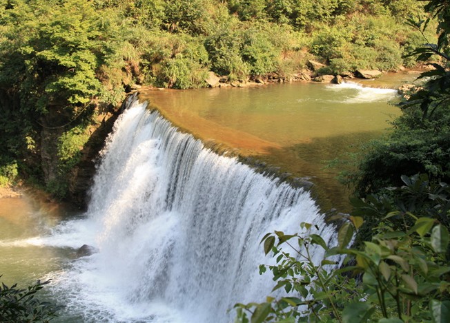 景如其名,此時(shí)游人仿佛置身于一個(gè)一塵不染的世外桃源境地。河水清澈見底,河床怪石林立。游人依修文桃源神舟旅游開發(fā)公司新建的觀光棧道而行,繼金雕崖景點(diǎn)之后,但見犀牛潭景觀——數(shù)股從半崖中涌出的清泉,飛流直瀉,墜落碧綠的犀牛潭中。銀練高懸,水花飛濺,一幅天然的山水畫面。版權(quán)所有山東聊城聊之旅國際旅行社有限公司,轉(zhuǎn)載必究!但凡漂流者經(jīng)過此景,皆有意蕩入泉下,接受泉水的洗禮,或曰洗去晦氣,或曰沾點(diǎn)清泉的靈性。還有一說,此道山泉能賜人以財(cái)運(yùn)。順流而下,在漂流段的終點(diǎn)處,既是桃源風(fēng)景區(qū)的接待處,也是景區(qū)游玩和食宿中心。此處更集中了大自然饋贈桃源河的精品——寬43米、37米落差的梯級大瀑布響水驚天,氣勢宏偉壯觀。站在瀑布下面的觀瀑臺,感受那水霧飛灑的靈氣,更令人心曠神怡。站在去接待中心的小橋上,仰望有波有折,一泉三態(tài)的三疊水瀑布,更有一番獨(dú)特的視覺享受。接待中心被流水纏繞,河灘、怪石、清泉,組合成一組天然的濱河泳場畫面。夜宿桃源度假中心,在潺潺流水的伴奏下,在清新水霧拂面的木屋里進(jìn)入夢鄉(xiāng),必將在你人生的旅程中留下深刻的記憶。