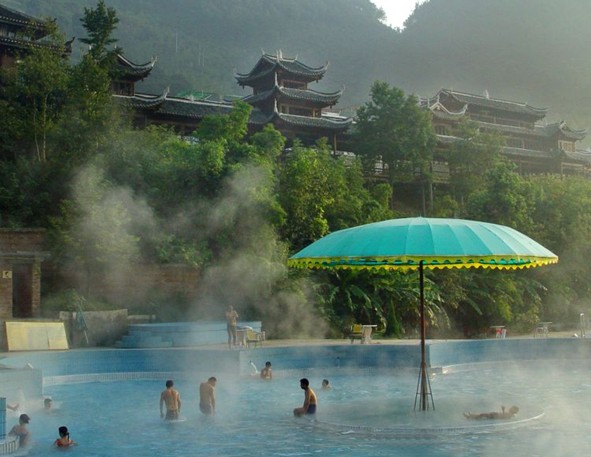劍河溫泉為國內(nèi)稀有的氡硫溫泉,日涌水量1800 噸,富含氡、硫、鐵、鉀、鈣等元素,其理化指標與法國著名的維稀溫泉相似,有消毒、去疾、健膚之功效,常浴可治療和預防多種疑難病癥,自古享有 “苗鄉(xiāng)圣水” 、“西部浴都”之美譽。1989年,在這里開發(fā)為現(xiàn)代化的溫泉浴場,里面有一幢內(nèi)設鴛鴦浴池、桑拿浴池、美容廳的“舒樂”健身房,還有4個露天浴池,其中有為當?shù)孛缱逋碛玫穆短煸〕兀线叺氖悄谐兀逻叺臑榕兀ㄋ┧齻冎两襁€保持著原始古樸的裸浴習慣。裸浴,在(他)她們看來,是一種自然現(xiàn)象,無須顧忌,對偶然出現(xiàn)在浴池邊的外地人,版權所有山東聊城聊之旅國際旅行社有限公司,轉載必究!只要你不是在有意偷看,(他)她們會毫不在意。