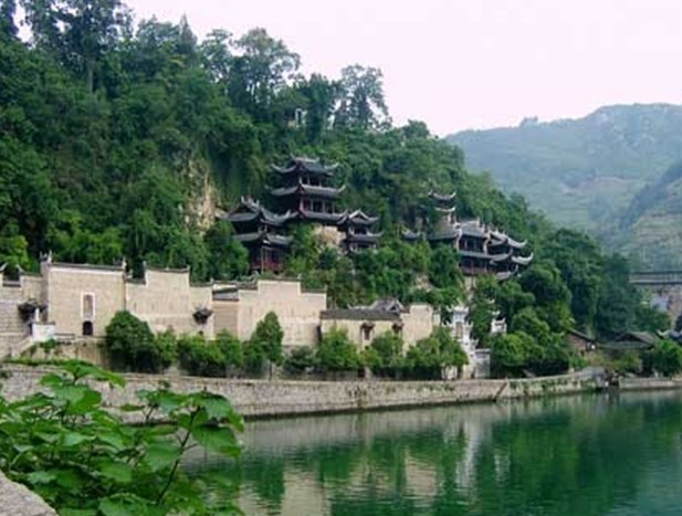 青龍洞古建筑群坐落在中國歷史文化名城——鎮(zhèn)遠城東的中和山上。這里山勢挺拔,峭壁懸崖。巨巖、洞穴和為一體。道、儒、佛三種宗教的寺廟群生就山腰。它背靠青山,面臨綠水,貼壁臨空,五步一樓,十步一閣,翹翼飛檐、雕梁畫棟。這些古建筑依山因地,分別采用了“吊”、“借”、“附”、“嵌”、“筑”等多種工藝,硬是在一段懸崖上筑出中元洞、紫陽洞、青龍洞、萬壽宮等一片閣樓洞天。