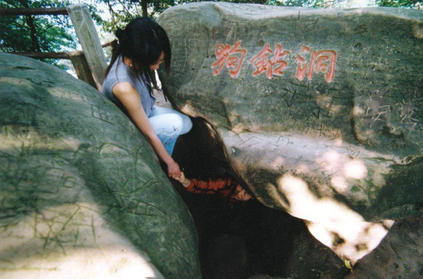 狗鉆洞:大舍身巖之北,相去100余米。數(shù)巨石重疊阻隔了道路,東西北皆懸崖,東西崖高近60米,在幾塊巨石中有一窄洞是必經(jīng)之道。洞內(nèi)不能蹲立,只可手地梭行。出口處右側(cè)臨空,所有蹲石可落腳,雖手扶洞內(nèi)石壁,腳點石壁間痕,蜿身而下,方可通過。因過此洞形同狗爬狀,故得名狗鉆洞。