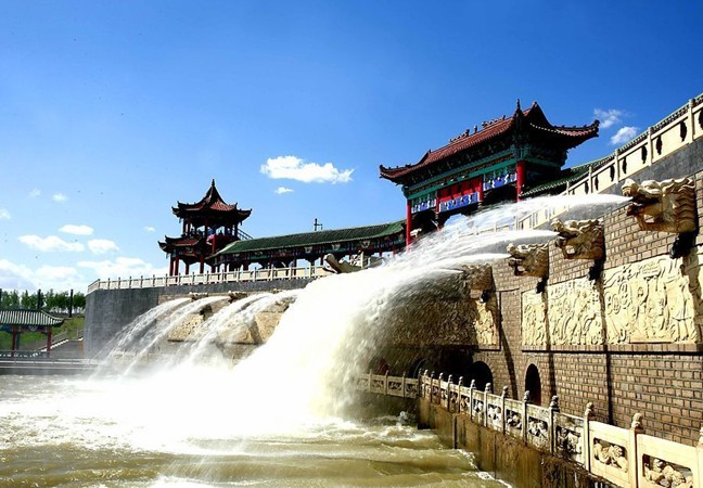 九龍?zhí)妒强死斠篮拥脑搭^所在,地處克拉瑪依河穿城風(fēng)景帶之首—東郊瀑布景區(qū)內(nèi)。該景區(qū)主要由高約8米的人工瀑布、瀑布下的巨潭和周圍大面積的綠化林帶草坪構(gòu)成。瀑布水源來自風(fēng)克干渠湍急的水流從中間的一條巨龍口中噴出,利用水的噴涌速度和自然重力形成寬約10米的巨大的瀑布,瀑布的兩邊分列的8條龍嘴也同時噴出水柱,構(gòu)成一副巨大的水廊。