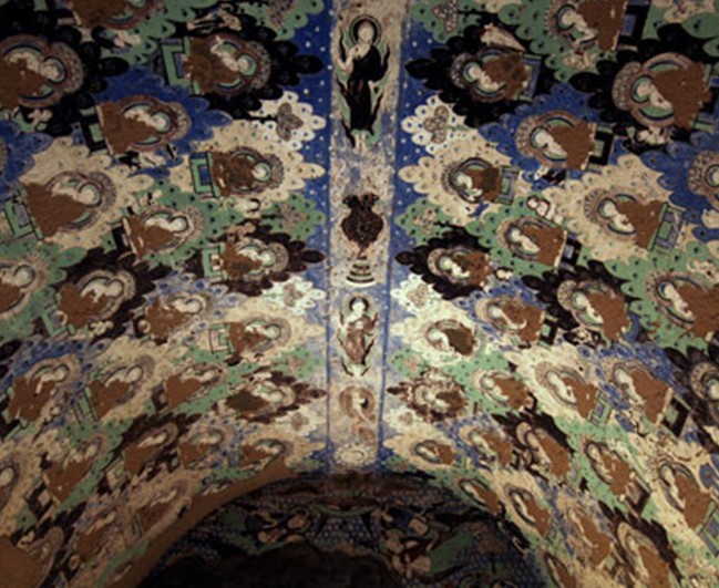 再往后到了公元6-7世紀(jì),為其繁盛期,目前石窟中一半都是屬于這個時期建筑而成的,造像普遍采用金粉或金箔敷貼。在此方形窟中因緣畫較為突出.建筑上以大型中心柱居多。因緣故事就是記釋迦加牟尼成佛后,云游四方,傳播佛法,常以因緣故事喻人,就產(chǎn)生了因緣故事,傳播因果輪回之說。大家看這個第8窟的菱格因緣圖,上畫的是猴子奉蜜于佛,佛云有蟲,猴去蟲又奉之,又曰太濃,猴就加泉水以稀之,再奉,佛和眾弟子飲了,猴很開心,一高興跌入水坑淹死了,因前身奉過佛,來生生于富貴人家做了富人,此類因緣故事在石窟中有100多種上千幅,但內(nèi)容較難識辨,其種類數(shù)量卻屬國內(nèi)罕見。