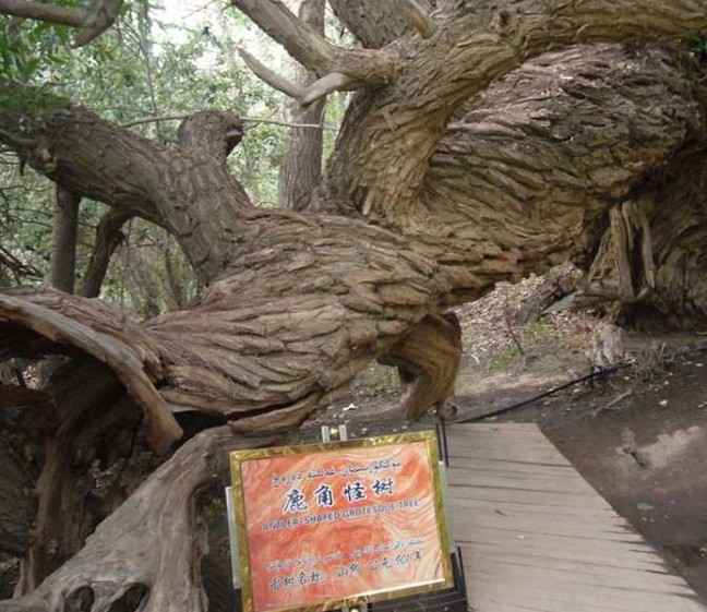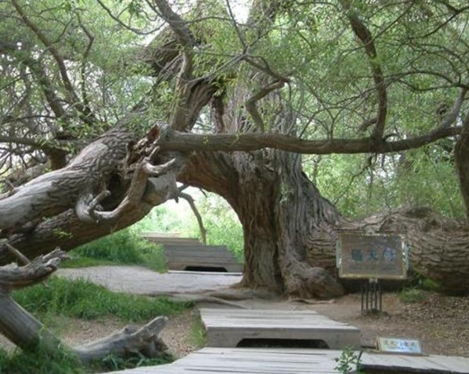 神木園其實是一處古墓地,它的原始名字叫庫爾米什阿塔木麻扎。在溫宿縣地圖上西北邊的一條公路兜住的那三個小圓點,就是新疆聞名遐邇的天山神木園的標(biāo)注。溫宿縣志•卷二十七•第五章第四節(jié)古墓葬中對此記載如下:庫爾米什阿塔木麻扎位于薩瓦甫牧場場部東北10.7千米。地理坐標(biāo):東經(jīng)79°42′26″,北緯41°35′32″。面積680畝,海拔1700米,尚存古墓數(shù)十座。相傳公元11世紀(jì),沙特阿拉伯的一名叫蘇力塔庫爾米什賽依德的伊斯蘭教阿訇,帶領(lǐng)兩千名教徒,經(jīng)印度到中國傳教,受到當(dāng)?shù)厝说牡种撇l(fā)生沖突。敗退至此地時,大部分教徒戰(zhàn)死,蘇也陣亡,便埋葬在這里,形成了一個占地頗大的麻扎。其中呈圓形的最大的一個是蘇的墳?zāi)梗m年久失修,確仍保持著穆斯林古老墓式。麻扎四周為戈壁荒丘,內(nèi)卻以草綠、樹怪、泉多而聞名遐邇。該麻扎高出地面50米,滿山遍野長滿了綠草,山地像披上了一張綠色的地氈。草地里有10余處泉頭,泉水淙淙,從草地穿行而過,樹形千姿百態(tài),有的似神龍游動,屈折盤旋,貼地而伸:有的樹高達(dá)96。23米;有的樹枝與根部相連,分不出那是枝,哪是樹根。很多樹都是百年以上的老樹,版權(quán)所有山東聊城聊之旅國際旅行社有限公司,轉(zhuǎn)載必究!有的老樹倒地后又從根部發(fā)出新枝,長成參天大樹。庫爾米什阿塔木麻扎,既是穆斯林朝拜圣地,又是風(fēng)景勝地,每年到這里朝拜、旅游者達(dá)萬余人次。為保護(hù)這一勝地,1986年縣財政拔款4萬元,群眾捐款十多萬元,對麻扎清真寺進(jìn)行了修繕,并建筑了磚圍墻和架設(shè)了鐵刺圍欄。1989年11月,阿克蘇地區(qū)文物管理所普查隊來此地考查,被定為縣級文物保護(hù)單位,縣有關(guān)單位派有專人管理。麻扎東南20米處有一古墓群,計十余座,尚未發(fā)掘考察。這是1993年7月出版的溫宿縣志記載。從志書考證,神木園曾是一片處女地。公元11世紀(jì),蘇力塔庫爾米什及其2000名教徒傳教殉職葬于此地后,當(dāng)?shù)厝艘詭鞝柮资舶⑺韭樵鸀榇说孛H缃衲莻€古老的命名也只能從志書中去搜尋考證了。