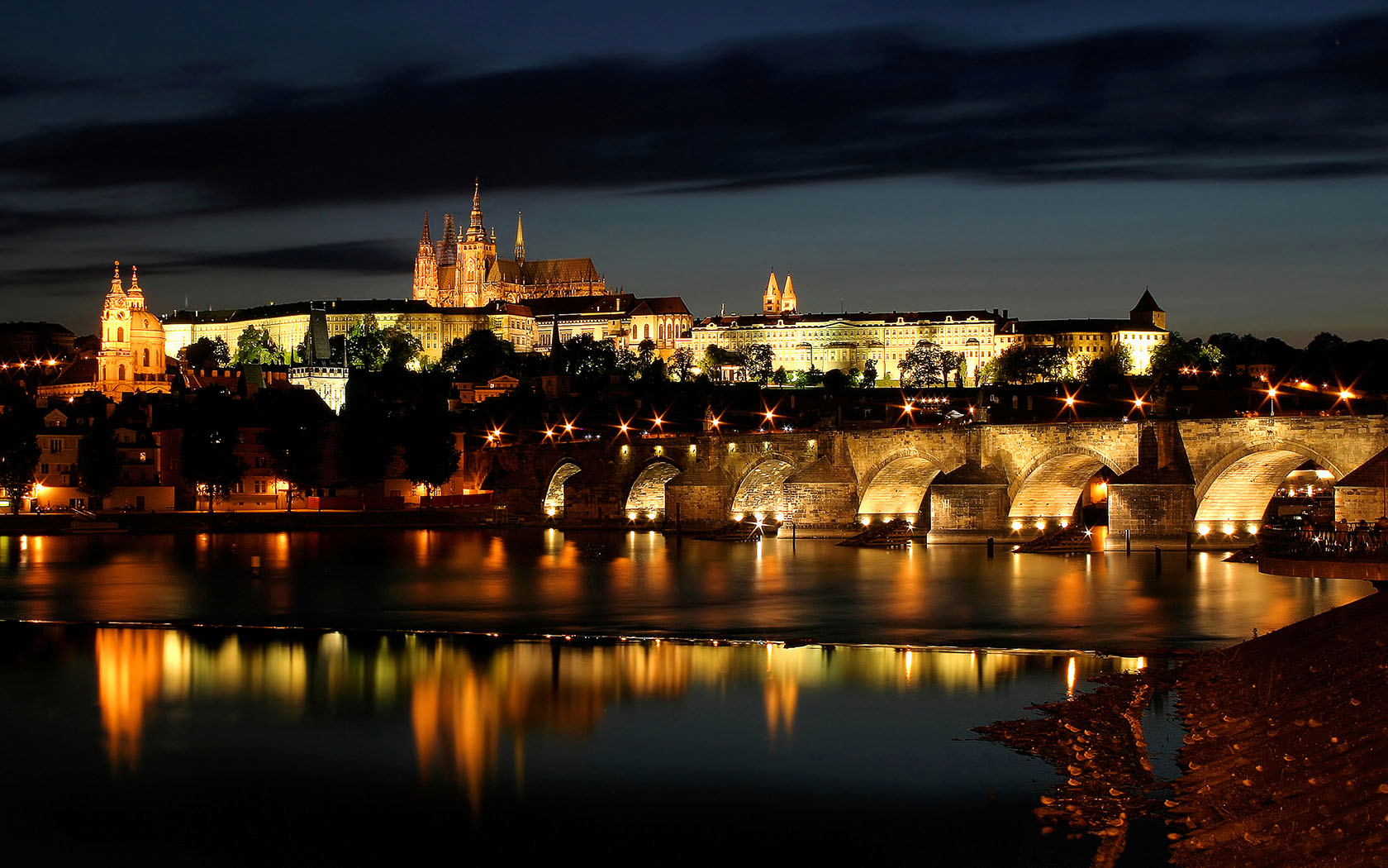 查理大橋的另一端通往著名的布拉格城堡。夜晚在河邊遙望城堡,昏黃的燈光照耀著河面,對面是一片黑黝黝的山丘,中間鑲嵌著宛如懸在半空的城堡。照射城堡的光并不絢麗,甚至不明亮,只是淡淡地把城堡烘托出來,營造出了神秘的氛圍,令人向往。
