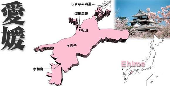 愛媛縣古稱伊予,位于四國西北部。北部偏東,南北走向細(xì)長(zhǎng)。面積約5677平方公里,居全國第25位。人口約143萬,居全國第27位。愛媛縣氣候溫暖,得天獨(dú)厚。由于坡地較多,雨水較少,適宜于果樹園藝和畜牧業(yè)的發(fā)展。下轄11個(gè)市9町。現(xiàn)任知事中村時(shí)廣,2010年12月當(dāng)選。