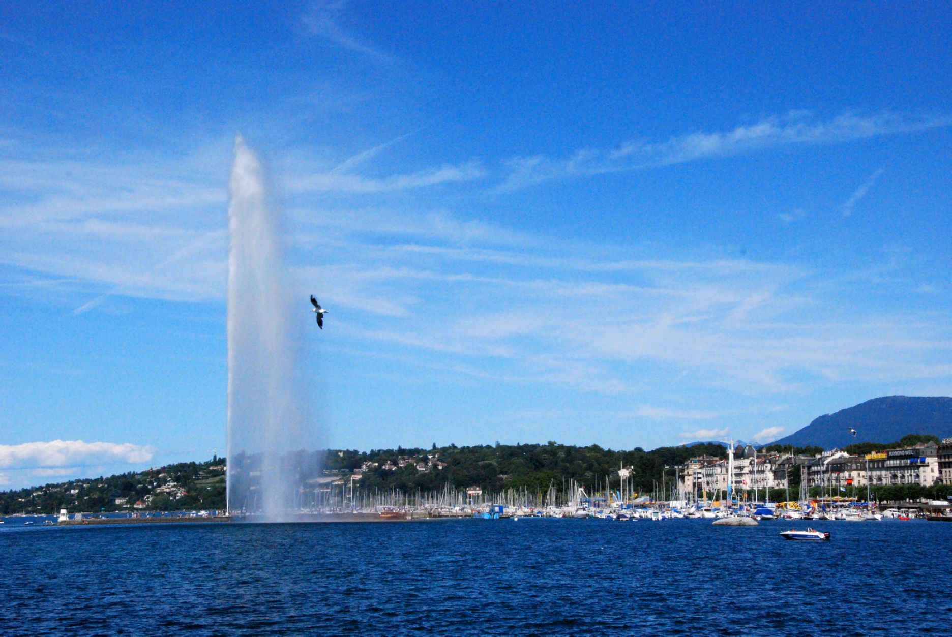500公升噴水量的噴泉是由130馬力的電力推動(dòng)為世界上最大的人工噴泉,那沖天而起的高大水柱,從湖面直射天際,蔚為壯觀。這個(gè)人工噴泉最初是1891年建成,當(dāng)時(shí)所噴射的高度只有90米。1958年改建后至今。它的動(dòng)力是兩組安裝在水下的水泵,總重為16噸,由每分鐘達(dá)1,500轉(zhuǎn)的500千瓦2,400伏的發(fā)動(dòng)機(jī)帶動(dòng)。每個(gè)水泵的功率為1,360匹馬力,噴泉的流量為每秒500公升,噴口處的水速達(dá)每小時(shí)200公里,進(jìn)入噴水管中的水的壓力為16個(gè)大氣壓,水柱的高度在無(wú)風(fēng)時(shí)可達(dá)140米,停留在空中的水量達(dá)7噸之多。水從噴嘴噴出達(dá)到頂峰再回到水面,每個(gè)回合為16秒。日內(nèi)瓦湖是美麗的。自古以來(lái),許多名作家、大詩(shī)人都贊美、謳歌過(guò)它。亨利•詹姆斯稱它是“出奇的藍(lán)色的湖”;拜倫則把它比喻成一面晶瑩的鏡子,“有著沉思所需要的養(yǎng)料和空氣”;巴爾扎克則把它說(shuō)成是“愛情的同義詞”。其壯觀景象,從日內(nèi)瓦各地都可以望得見,如今大噴泉于每年三月初到十月的第一個(gè)禮拜天為止,除了陰雨天之外,每天都準(zhǔn)時(shí)做“噴水表演”,供民眾參觀。