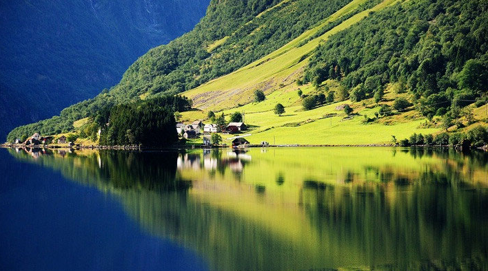 “兩岸山巒起伏,層林疊翠,忽而云霧繚繞,虛無縹緲,忽而白雪皚皚,寒氣逼人。峽灣的水清澈透明,水面如鏡。海水即使風高浪急地咆哮而來,到了峽灣內(nèi),也只好乖乖地向高山峻嶺低頭,收起煩躁的心潮,變得風平浪靜了。在沒有游船經(jīng)過時,峽灣的水面幾乎沒有任何波浪。在陽光的照耀下,海面泛起粼粼的波光”。