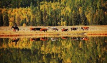 鴨澤湖位于禾木喀納斯蒙古族鄉(xiāng)境內(nèi)喀納斯村南邊,它是由喀納斯河改道后廢棄河段——牛軛湖洼地組成,呈長形蝶狀,沿洼地南端形成一個南北走向的寬淺湖泊,形似蝶狀的一弘碧水與沼澤濕地連為一體,面積約1.3 平方公里。