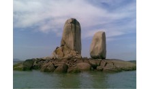 半洋石帆又稱石牌洋,在福建平潭島西北看澳村西側(cè)500多米的海面,遠(yuǎn)遠(yuǎn)望去有一個(gè)圓盤狀的大礁石,托著一高一低的兩塊碑形海蝕柱。整個(gè)礁石象一艘大船兩塊巨石象兩面鼓起的雙帆,似乎正在乘風(fēng)破浪前進(jìn)。這是平潭最著名的自然景觀——石牌洋。又稱為“半洋石帆”和“雙帆石”。