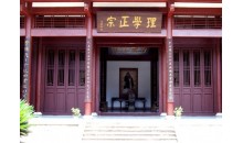 造型莊重、嚴謹?shù)奈湟纳街祆浼o念館,是一座于1990年落成的廡殿式大院。館內(nèi)懸掛著新近書寫的匾額、楹聯(lián),其中有不少聯(lián)文,語言精練、寓意深長,文彩斐然。古樸的大門上高懸著一塊大匾,題為“朱熹紀念館”五個醒目大字。是方毅同志在武夷山視察時留下的墨寶,莊重、蒼勁,有書法大家的風范。朱熹在武夷山講學40余年,繼承和發(fā)展了理學體系。殿前大門兩側(cè)的草書楹聯(lián)表達了朱熹繼承和發(fā)展的深邃意義。