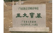 王大寶墓位于潮安縣歸湖鎮(zhèn)神前村的神前山,其地俗稱沉江月,占地約4畝,筑于宋乾道六年(1170)。墓地向西,墓碑高約2.3米,楷書陰刻“宋禮部尚書大寶王公墓”。墓前排列著南宋大型石雕群,計文武翁仲、石獅、石羊、石筍、石望柱、石馬等14件,石雕線條粗?jǐn)U,工藝簡練古樸,反映了南宋的雕刻藝術(shù)水平和風(fēng)格,是廣東省現(xiàn)存為數(shù)不多的大型宋代石雕。1989年王大寶墓被列為廣東省重點文物保護(hù)單位。