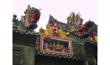 陳家祠為三進(jìn)院落四合院式布局,占地面積4000多平方米,主體建筑均為硬山頂,面寬進(jìn)深各三間,抬梁與穿斗混合式梁架結(jié)構(gòu)。中座前為一大石階平臺(tái),旁圍石柱欄桿華板,工藝精細(xì)。兩側(cè)廡廊,以木雕飛罩間隔,各分三間,花鳥蟲魚,鏤空雕刻,長(zhǎng)廊屏門,上則格心通花彩色玻璃,下則刻花裙板,朱欄畫棟,富麗堂皇。中座后壁,全為五米多高的坤甸木雕花大屏風(fēng),雕工精美古樸壯觀,現(xiàn)存的巨型木雕祭桌,獸首柱腳,古拙凝重。