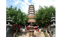 據(jù)清光緒《嘉應州志》載,由南漢王劉鋹始建于大寶八年(公元965年),距今已有一千多年歷史。鐵塔分為七層,身高4.2米,呈四方形,塔底邊長1.6米,為生鐵鑄成,每面鑄有大小佛像250個,四面合計為一千佛,故名千佛塔。原塔建于修慧寺,因寺毀,清乾隆初年嘉應州官王者輔將鐵塔移于梅城東巖山頂,上面蓋亭宇,周圍筑欄桿,并砌石階,以供游覽者登臨觀賞。