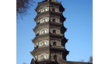 七級浮屠塔 高約37米,布局為國內(nèi)罕見,正面朝南,緊連磚建硬山式地藏殿。殿前接三間卷棚敞廳,東西兩側(cè)各設(shè)兩層塔式鐘鼓樓。塔東、南、西三面和北面三層以上開窗,余皆在外設(shè)拱形佛龕,塑以生動的羅漢浮雕31尊。殿塔相通,供奉三大佛、四菩薩七尊銅像。 塔內(nèi)有木梯,可供登臨觀賞。殿和塔檐下的雀替做成龍、鳳、獅、鶴等浮雕,造型生動。塔的局部構(gòu)件和裝飾具有西方建筑的風(fēng)格。