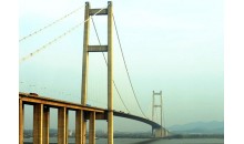 江陰長(zhǎng)江公路大橋,位于江蘇省江陰市黃田港以東3200米的西山,主跨1385米(328+1385+295),橋塔高190米,為兩根鋼筋混凝土空心塔柱與三道橫梁組成的門(mén)式框架結(jié)構(gòu),重力式錨碇,主梁采用流線型箱梁斷面,鋼箱梁全寬36.9米,梁高3米,橋面寬29.5米,雙向六車道,兩側(cè)各設(shè)寬1.8米的風(fēng)嘴,1999年建成。