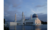哥達(dá)京那巴魯市立清真寺座落在里卡士灣畔(Likas Bay),是一座典型的當(dāng)代伊斯蘭教建筑,是馬來西亞夕陽景觀最壯麗的清真寺之一。它建于里卡士灣的人造湖上,感覺有如浮在水面之上,因而得到“水上清真寺”的美稱。令人驚嘆的白色建筑物造型,與藍(lán)天完美的連成一體。清真寺于1997年建成,占地一公頃,可容納最多12,000名教徒祈禱。