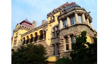 青島總督府,氣勢宏偉,建筑面積為4083平方米,高度為30米,厚達60多厘米的外墻以黃色為基調(diào),局部以花崗巖石料作裝飾,石面加工粗樸,正門墻飾以淡綠色、淡灰色花崗巖石,頂部石料雕以美麗的圖案,于粗放之中見精巧。米紅色筒瓦、藍色魚鱗瓦、綠色牛舌瓦鋪設的樓頂,使大樓更加精美別致。1957年環(huán)繞迎賓館修建了圍墻形成了占地面積達86000多平方米的庭院,院內(nèi)遍植果樹和多種觀賞植物。