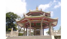 位于海豐縣城北面的五坡嶺上(編者注:彭湃中學(xué)后面),坐西北向東南,占地960平方米。前面分五層34級臺階,臺階上面是一幅長20米、寬13米的月臺,中心建一重檐攢尖頂,通高9米。亭內(nèi)后側(cè)再置一廡殿頂小石亭,高3.9米,內(nèi)豎一碑,高2.7米,寬0.9米,刻文天祥畫像。該亭為紀念南宋民族英雄文天祥當年方飯五坡嶺時不幸被捕而建,故取名“方飯亭”。