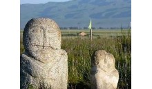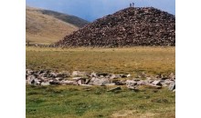 三海子墓葬及鹿石位于新疆維吾爾自治區(qū)青河縣查干郭愣鄉(xiāng)三海子夏牧場,為青銅時代的一處墓葬,距今約4000年。在面積約16.25平方公里地域的四個分布區(qū)內(nèi)計有石圍石堆墓、石棺墓30余座,鹿石19通。什巴爾庫勒石圍石堆墓,石堆直徑78米,殘高25米;石圍直徑210米,寬3~5米。石堆與石圍之間有四條片石鋪成的通道,最寬的通道達1.6米。墓環(huán)水而建,氣勢宏偉,結(jié)構(gòu)獨特,是歐亞草原少有的特大規(guī)模墓冢之一。